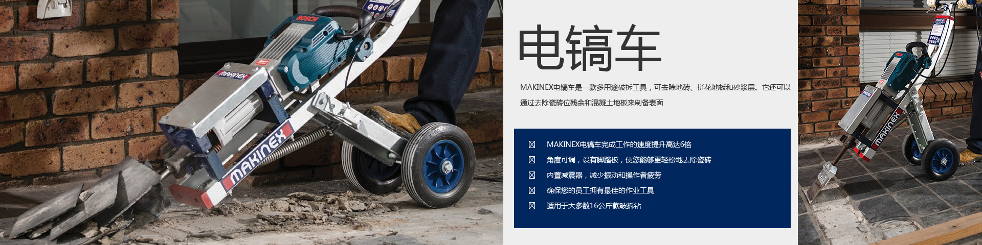 MAKINEX電鎬車是一款多用途破拆工具,可去除地磚、拼花地板和砂漿層。它還可以通過去除瓷磚位殘余和混凝土地板來制…
